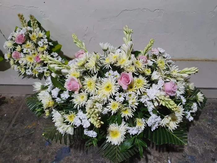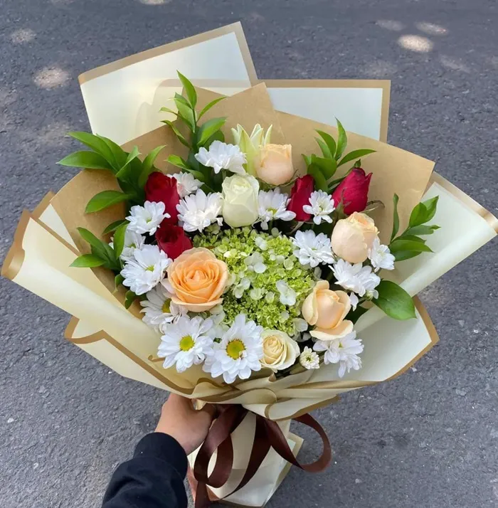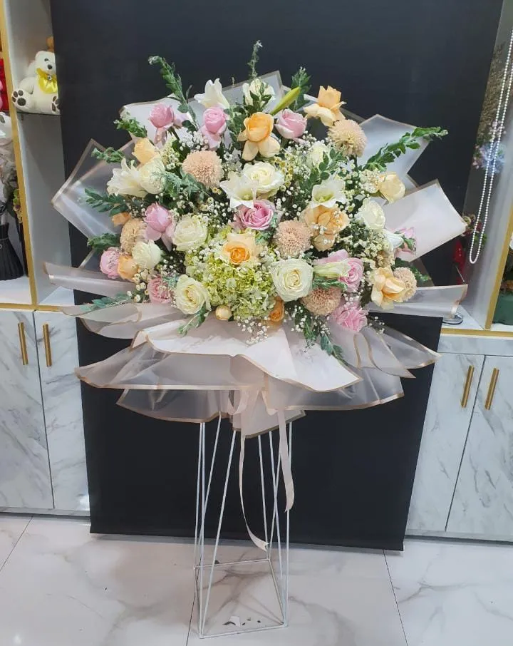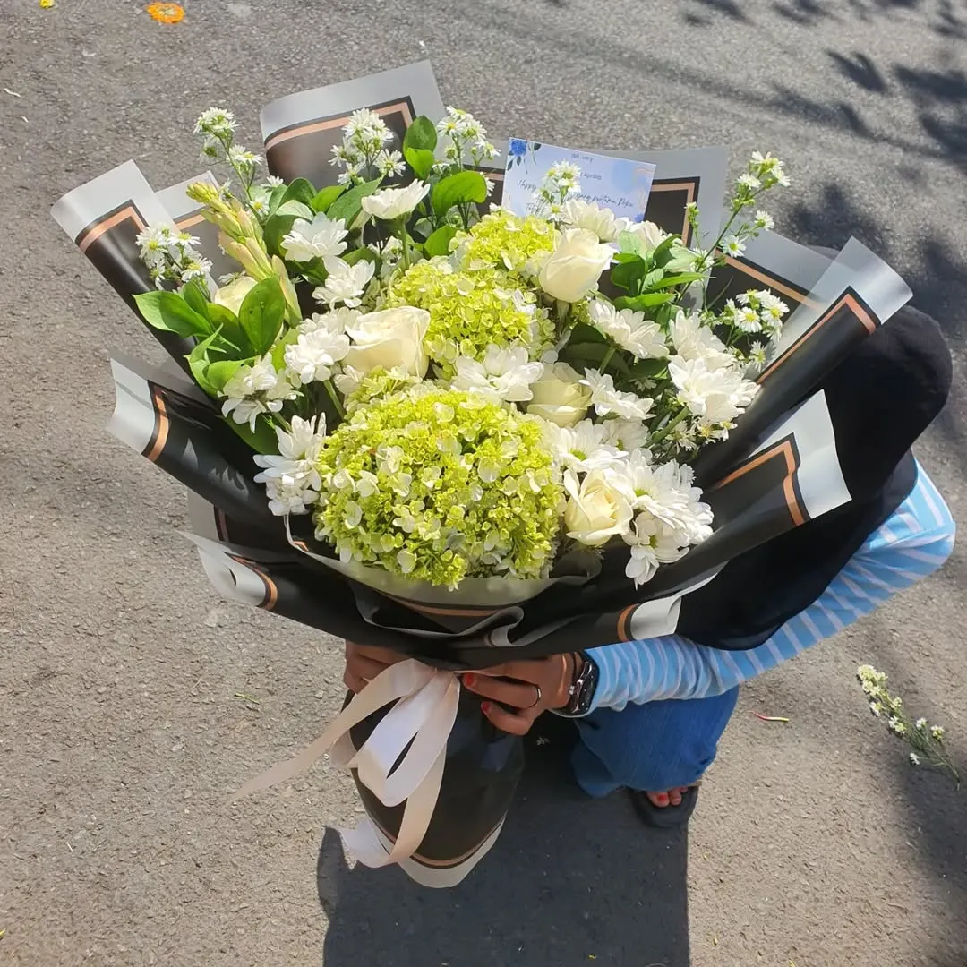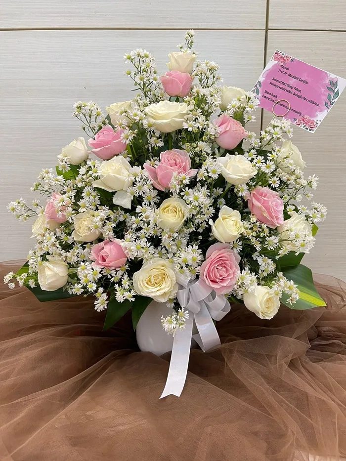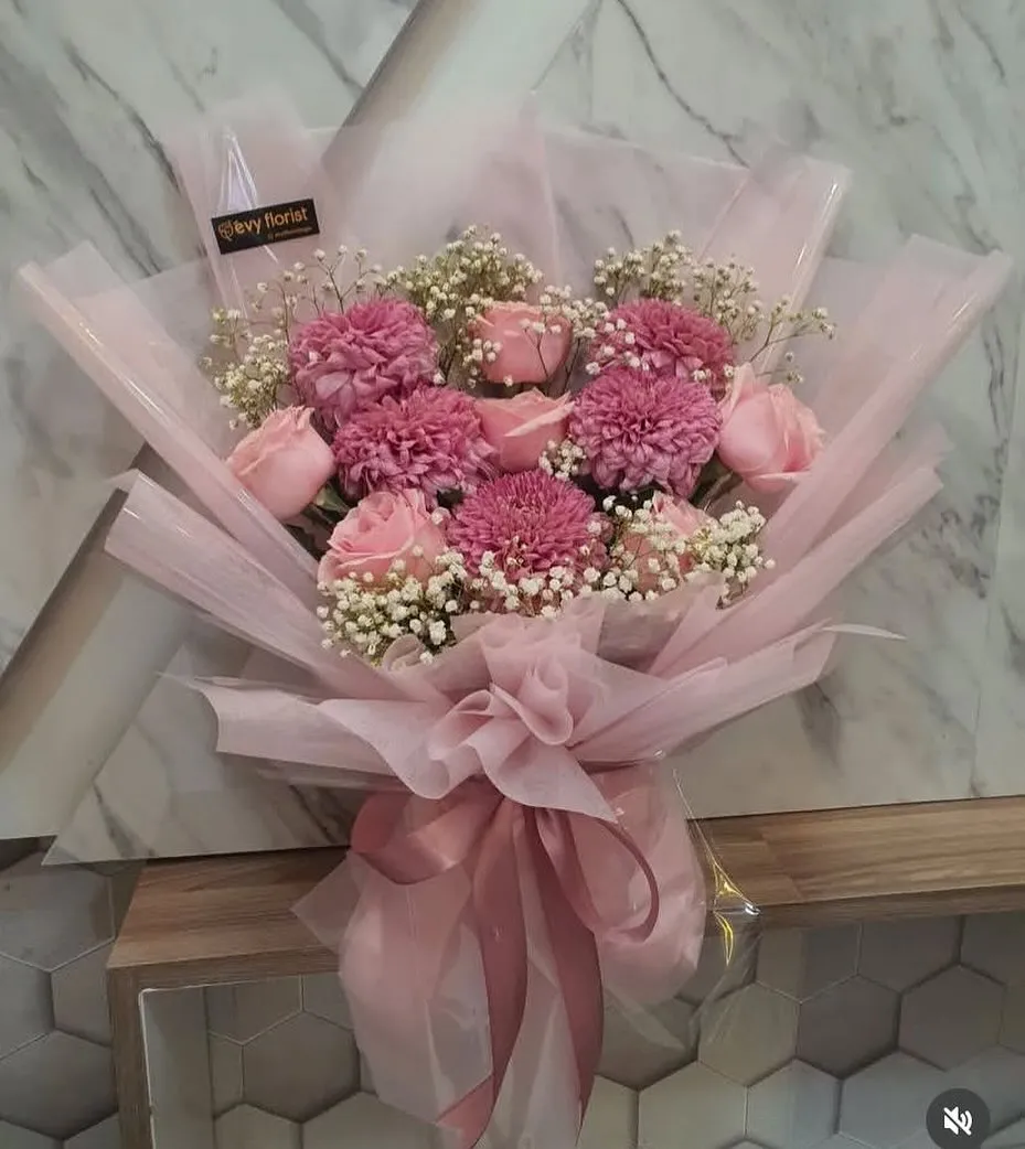 Hand Bouquet Nuansa Pink Romantis Mawar pink yang lembut, krisan pink, dan baby’s breath putih cantik disusun dalam balutan wrapping pink transparan dengan pita senada. Bouquet ini memancarkan kesan manis, feminin, dan penuh perhatian—pilihan sempurna untuk hadiah ulang tahun, sahabat, atau pacar tersayang